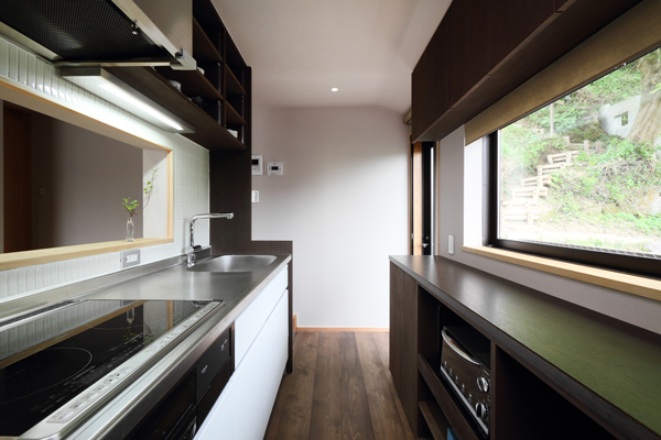 庭が望めるコンパクトなキッチン。しっかり収納も充実。