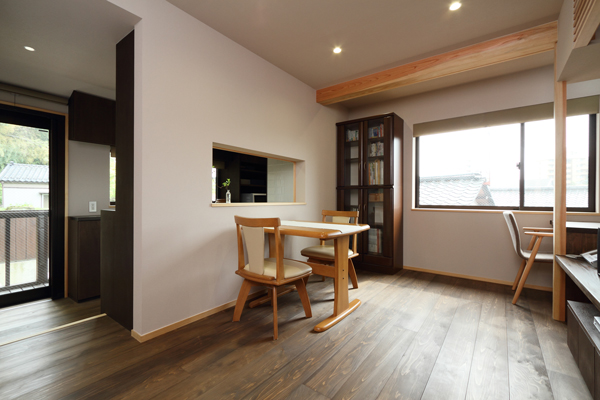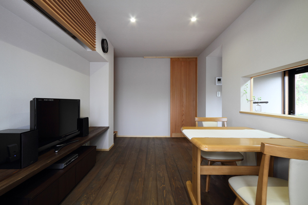 リビングダイニング、杉の引き戸なかなかいいでしょ。